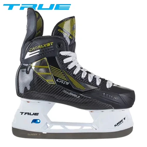 The True Catalyst 9 Skate was designed for ultimate fit and mobility in an ultra-lightweight package. The full composite carbon fiber one-piece boot sheds weight while maximizing explosiveness, all without sacrificing the extra moldability that results in the custom-like fit and feel that True Hockey is known for.